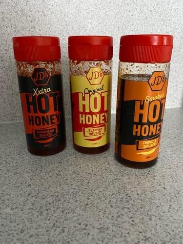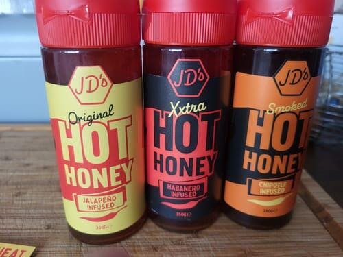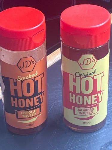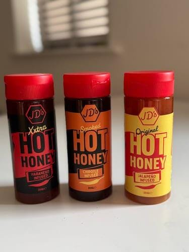 JD's Original Hot Honey(260g)- Delivering a red Jalapeno infusion to give you a medium sweet heat, the perfect partner for pizza, fish, chicken, roasted veg or ice cream.